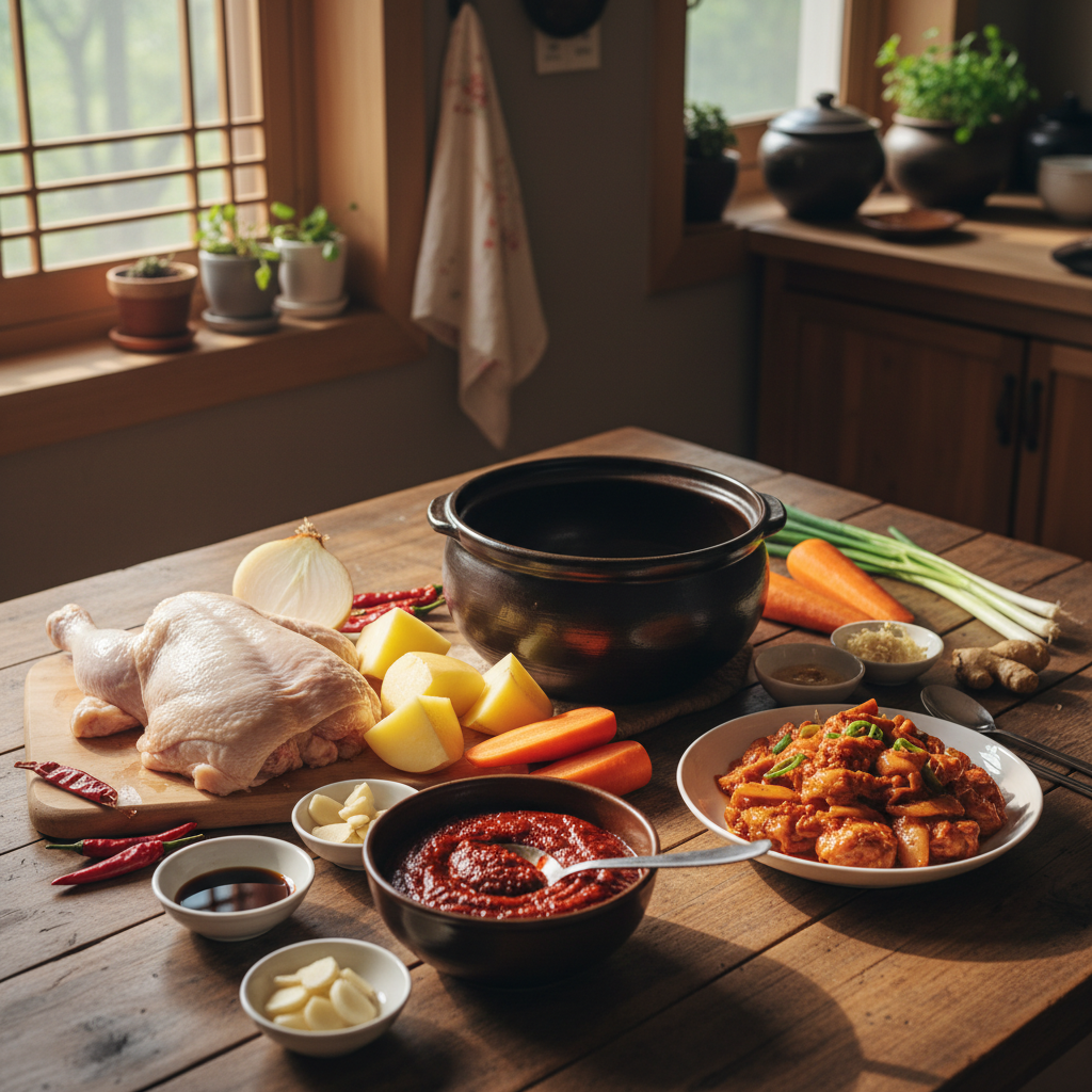 닭볶음탕은 재료 수가 많지 않아도 충분했습니다. 핵심은 주재료를 먼저 정하고, 양념은 미리 작은 그릇에 섞어 두는 것이었습니다.
