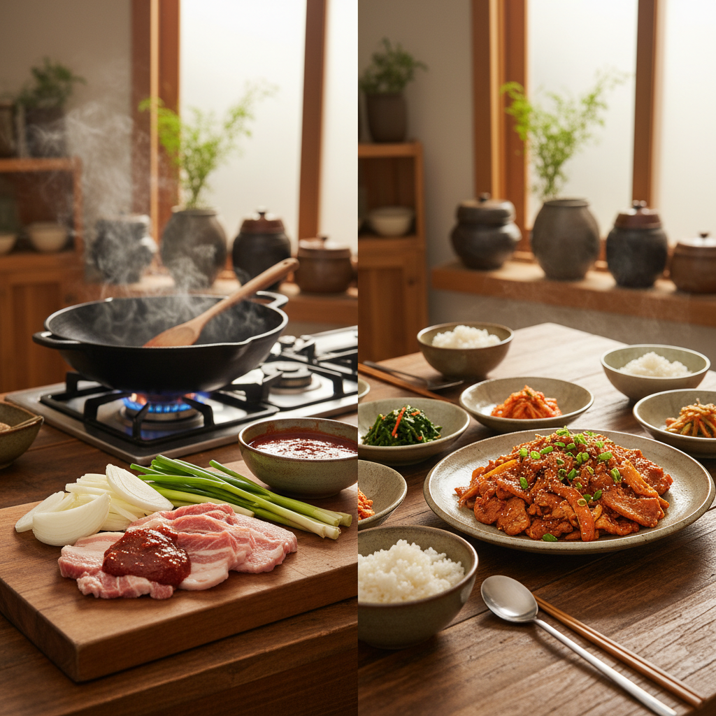 제육볶음은 양념을 진하게 한다고 맛있어지지 않았습니다. 돼지고기 두께, 양파와 대파 넣는 순서, 센불을 쓰는 시간만 맞춰도 물기 없이 훨씬 깔끔하게 볶아졌습니다.